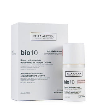 Bio10 Serum anti-macchie per pelle mista-grassa è il prodotto più efficace di Bella Aurora per combattere le macchie cutanee di melanina e lipofuscina, sia diffuse che localizzate, con la maggiore concentrazione di agenti depigmentanti.
